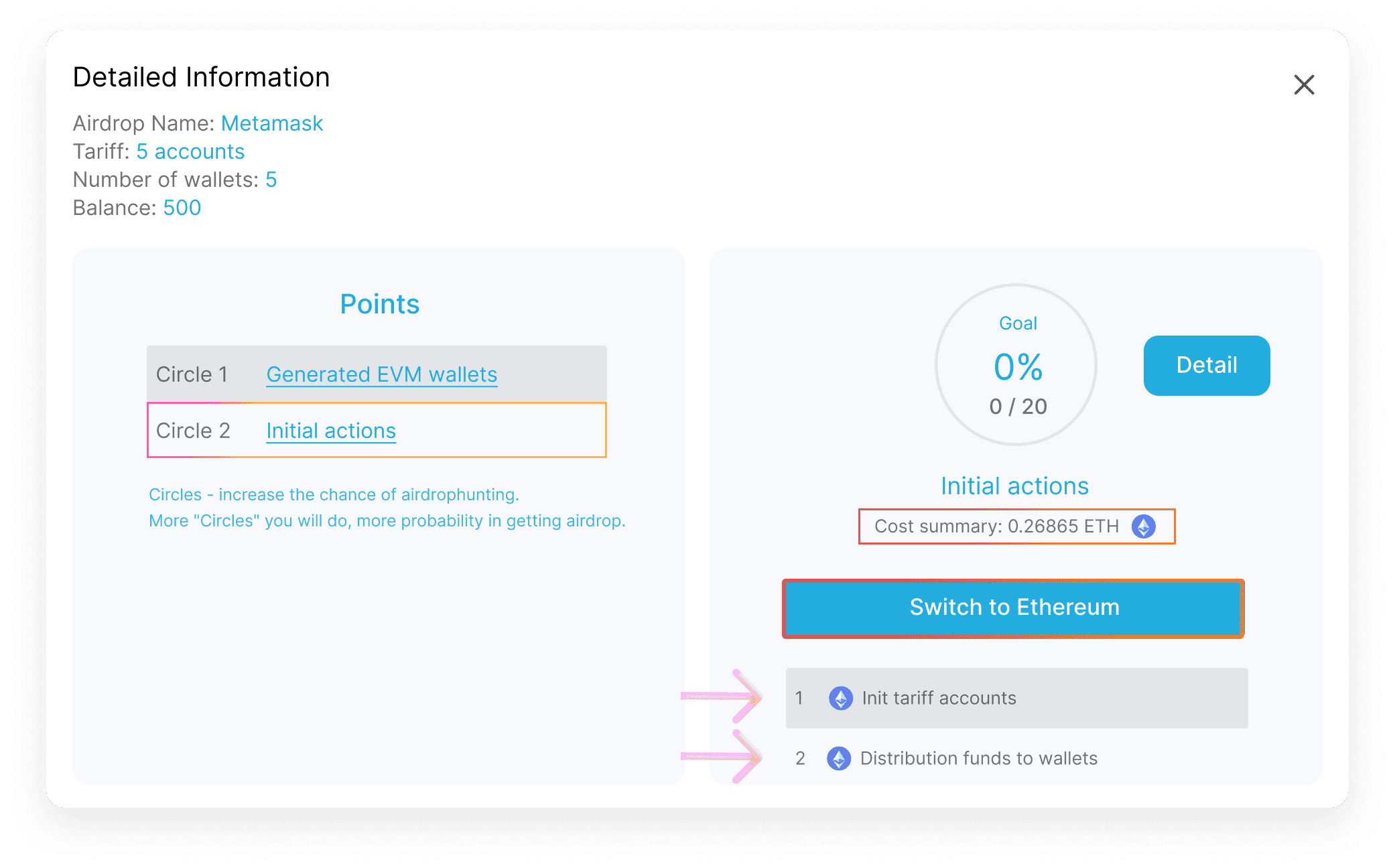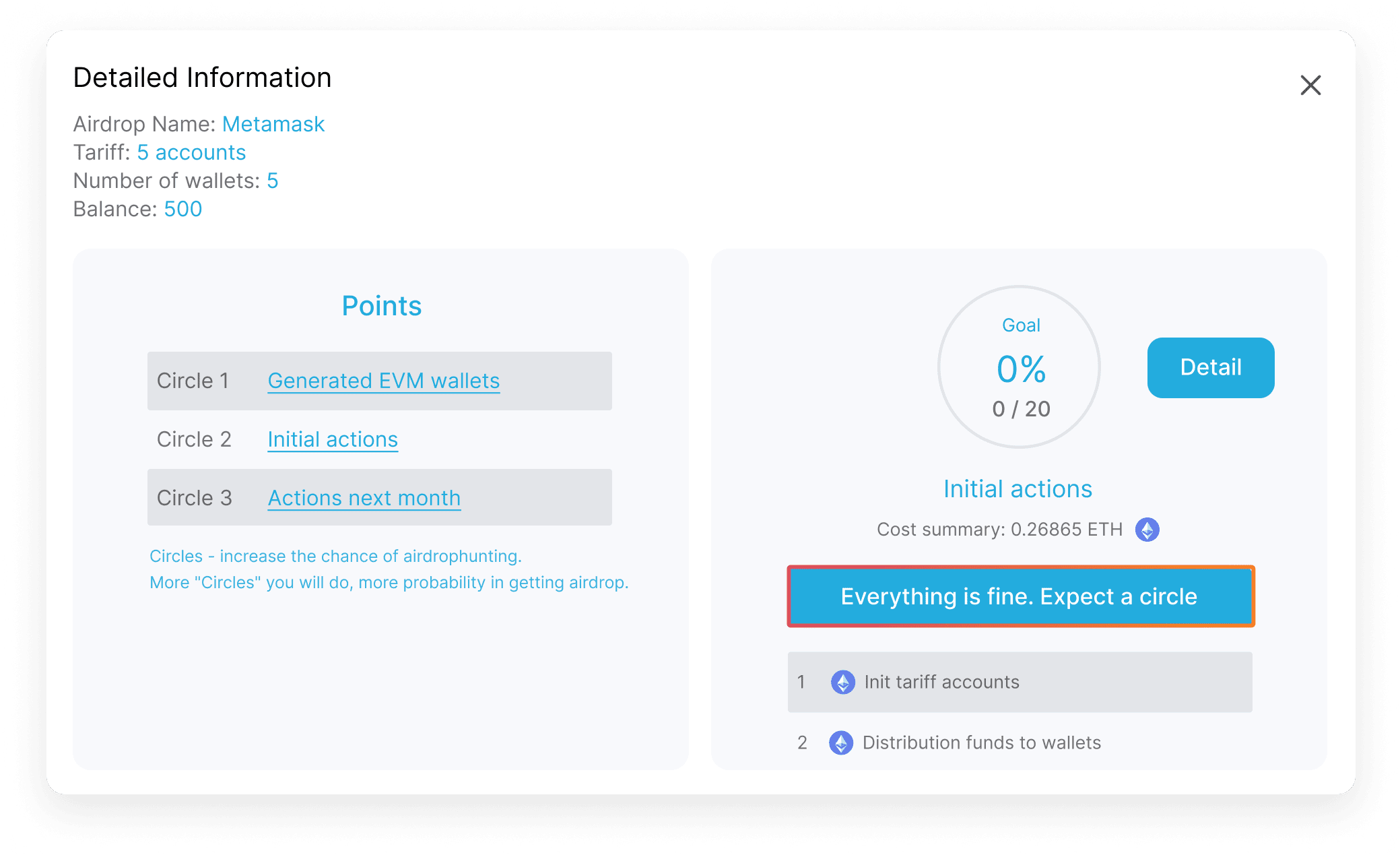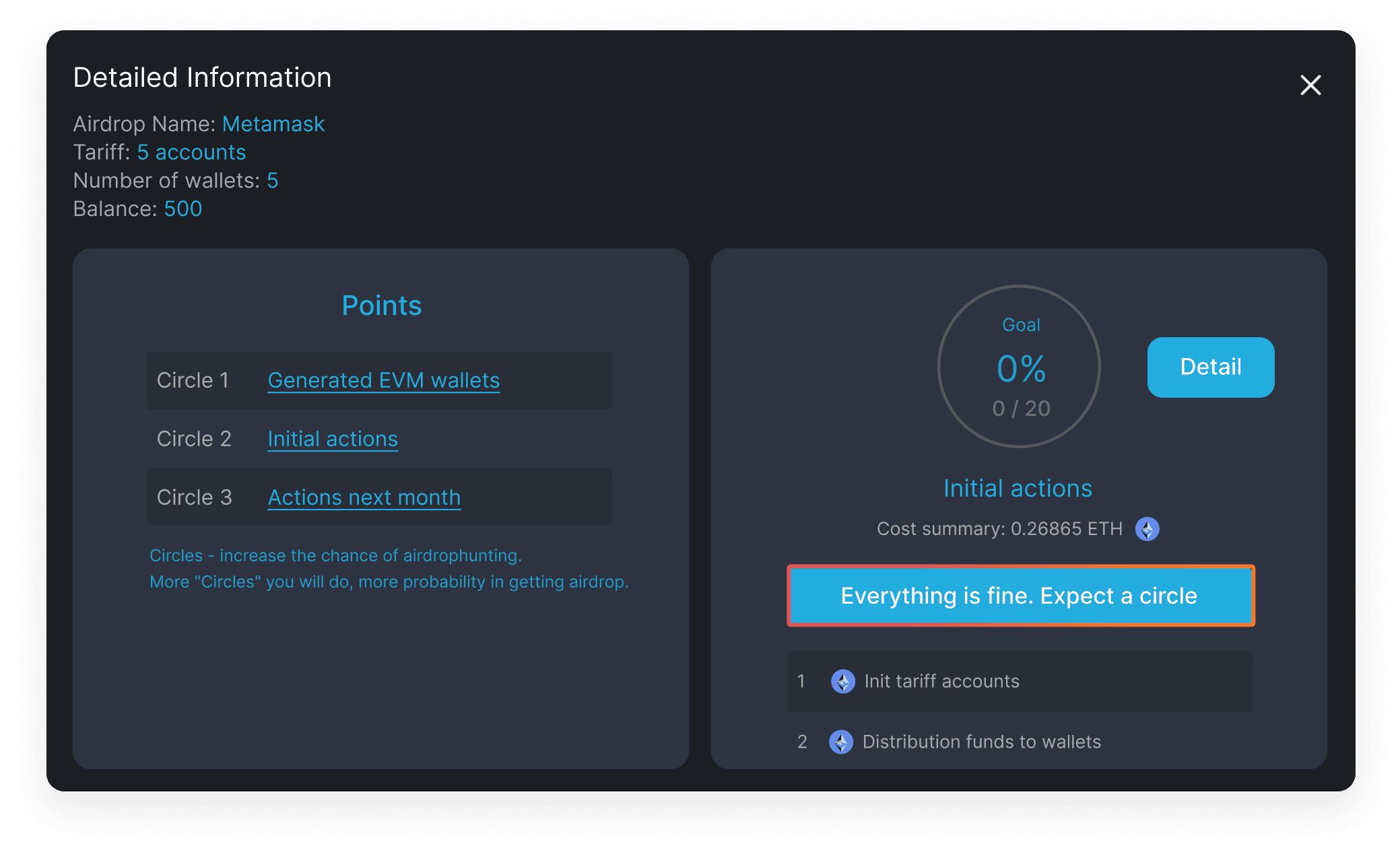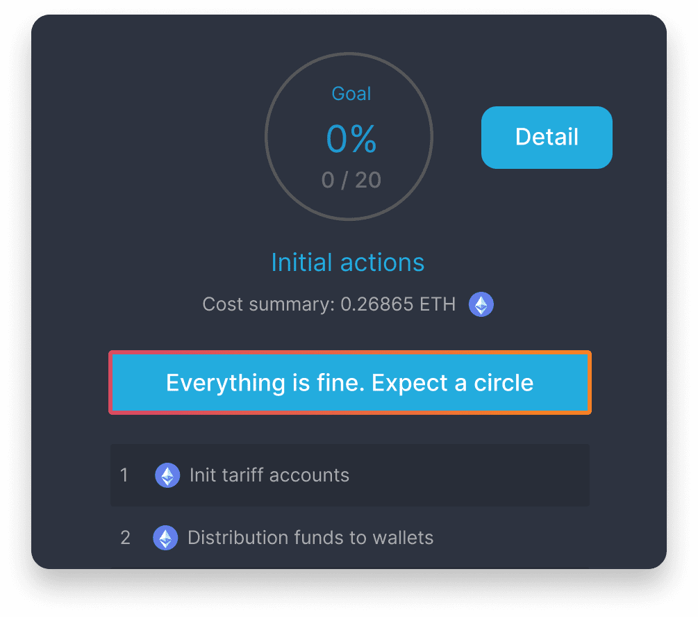 9. Add liquidity, click on «Circle 2» => «Init» => «Approve» => «Distribute»